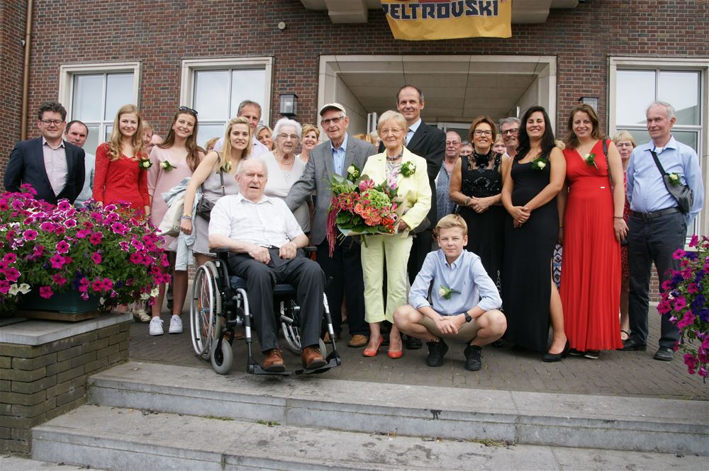 Free Jannis (89) en An Dilissen (82), van de Wuytenweg, hun diamanten huwelijksjubileum. Daar hoorde uiteraard een ontvangst op het gemeentehuis bij. Free werkte heel zijn actieve loopbaan tot aan zijn pensioen in 1992 als inspecteur op de Registratie en Domeinen. Na enkele jaren les te hebben gegeven als regentes huishoudkunde zorgde An voor Free en hun vijf zonen. Beiden engageerden ze zich, o.a. als lesgevers Nederlands in het Valkenhof. Voorafgaand aan het avondfeest werden ze samen met familie, vrienden en buren op het gemeentehuis ontvangen. Proficiat !