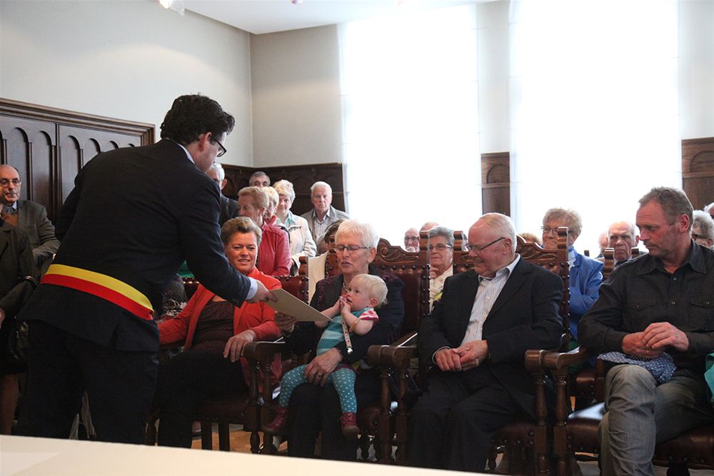 Michel Flup Sleurs en Berb Serroyen feestelijk op gemeentehuis ontvangen ter gelegenheid van hun