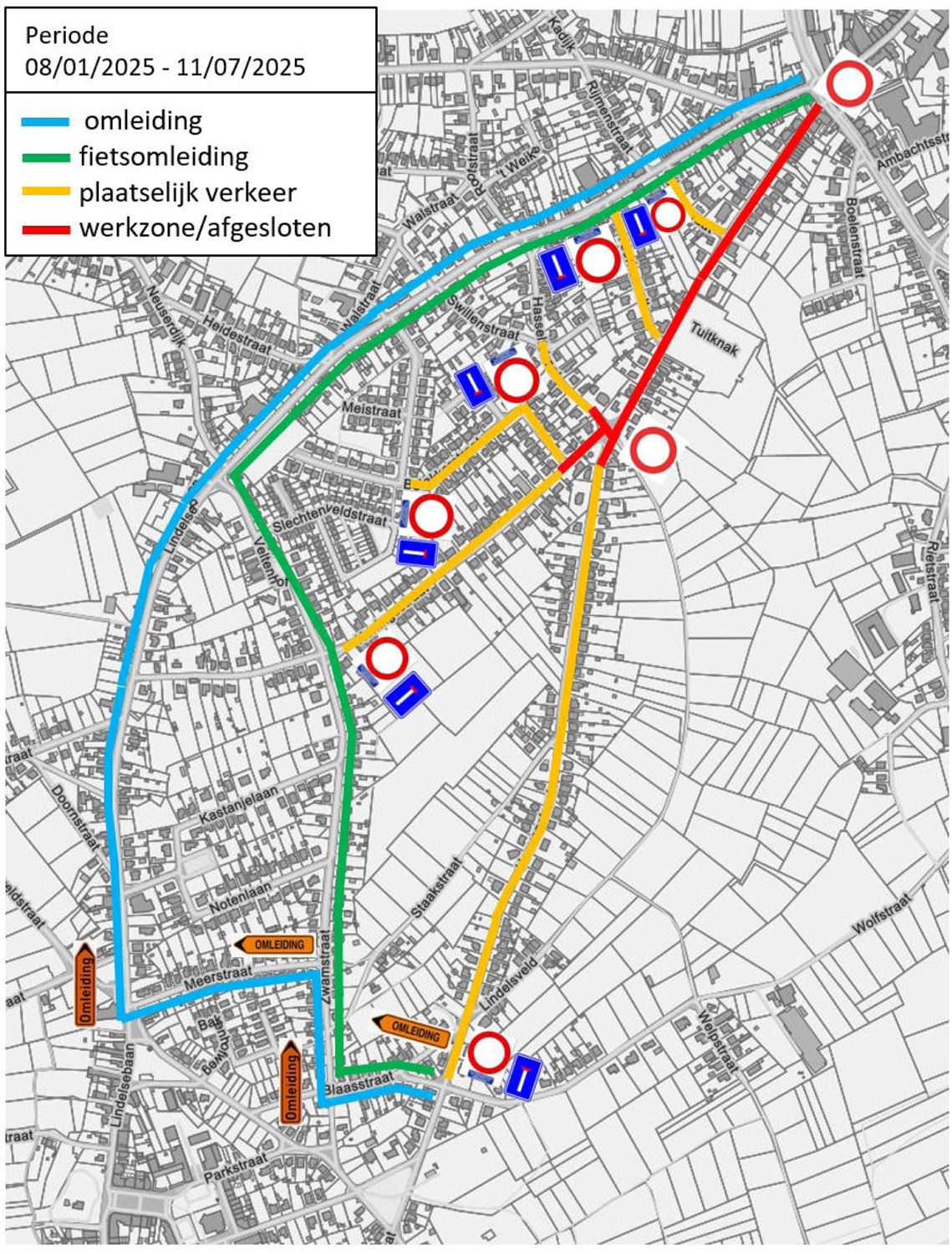 Tot nu toe was er in de Willem II-straat nog verkeer in één richting mogelijk. Vanaf de aanvang van deze werken op 8 januari geldt er een verbod voor alle gemotoriseerd verkeer in de gehele werkzone (rood op het kaartje). In de straten die aansluiten op de Willem II-straat (Pijpenstraat, Voorhasselt en gedeelten van de Hasseltstraat, Bolakkerstraat, Koningsstraat en Hoevenstraat) is enkel plaatselijk verkeer toegelaten. Het verkeer wordt omgeleid via de Lindelsebaan.