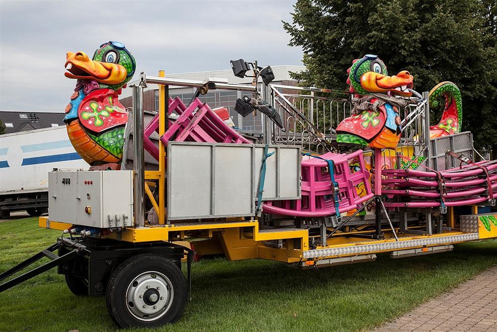 zomerkermis in het Lindel. De eerste wagens zijn gearriveerd en zullen in de komende dagen opgesteld worden. De meeste attracties zitten nog onder een zeil, maar sommige laten zich al zien - zoals de attractie op deze wagen. Ze moet nog helemaal gemonteerd worden.