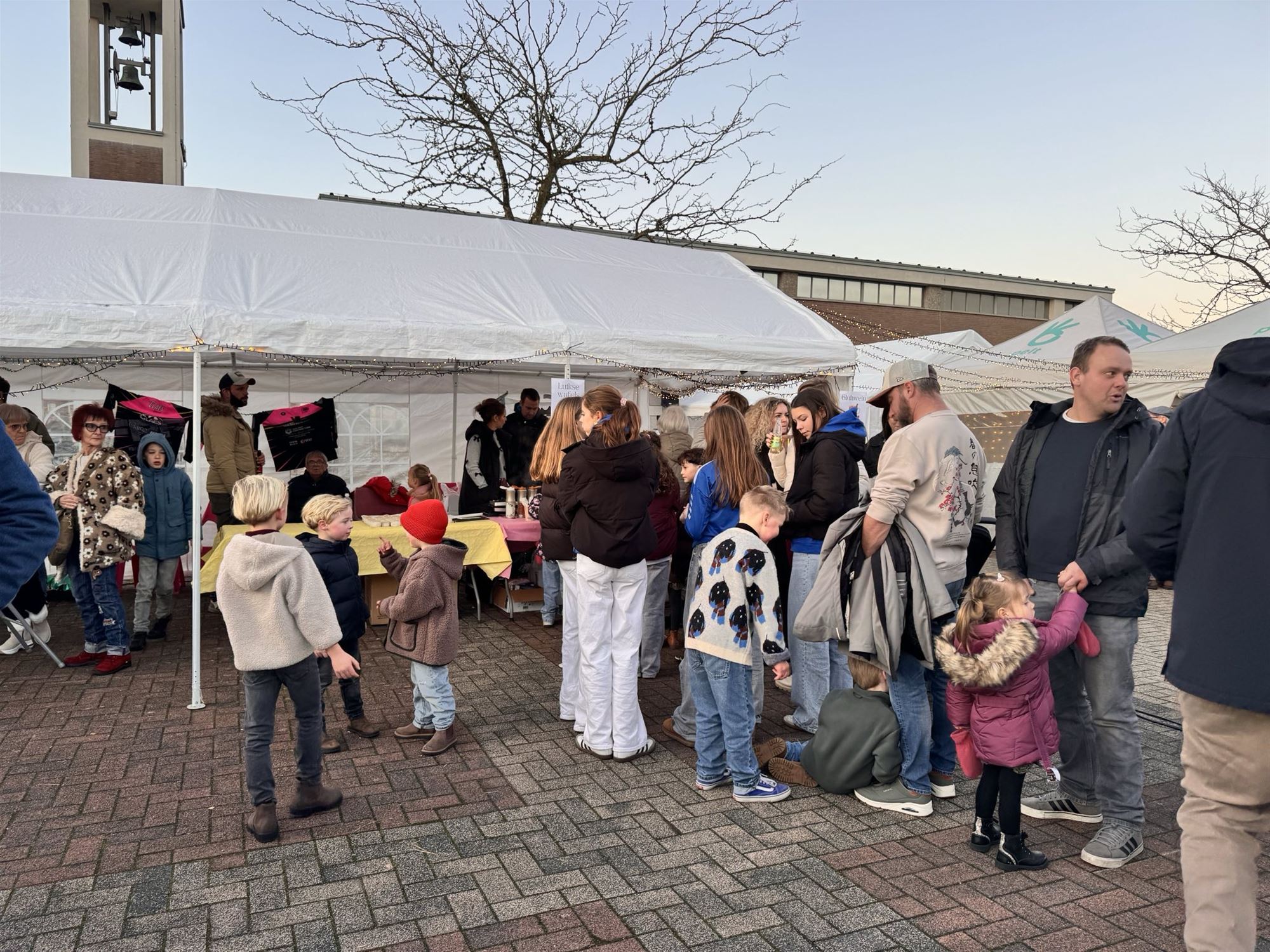 Buiten op het Kerkplein heerste een warme kerstsfeer. Lokale verenigingen zorgden er voor eten en drinken, met onder meer soep, worstenbroodjes, snacks, wafels, glühwein en warme chocolademelk. Familie en vrienden genoten er zo samen van een gezellig samenzijn in eindejaarssfeer.