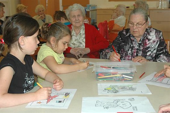 op bezoek in het oude gedeelte van het rusthuis: het klooster en de afdelingen ’t Ven en ’t Heike. Ze kwamen er samen met de bewoners tekeningen inkleuren