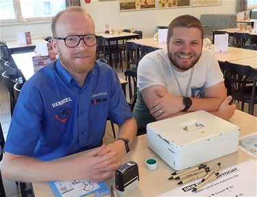 Drievalleientocht rijden. Vanmorgen fotografeerden we in De Bosuil de inschrijvingstafel, met links Bart Schreurs van WTC "Allemaal op de Fiets" en rechts Bob Vandermeulen van de gemeentelijke sportdienst.