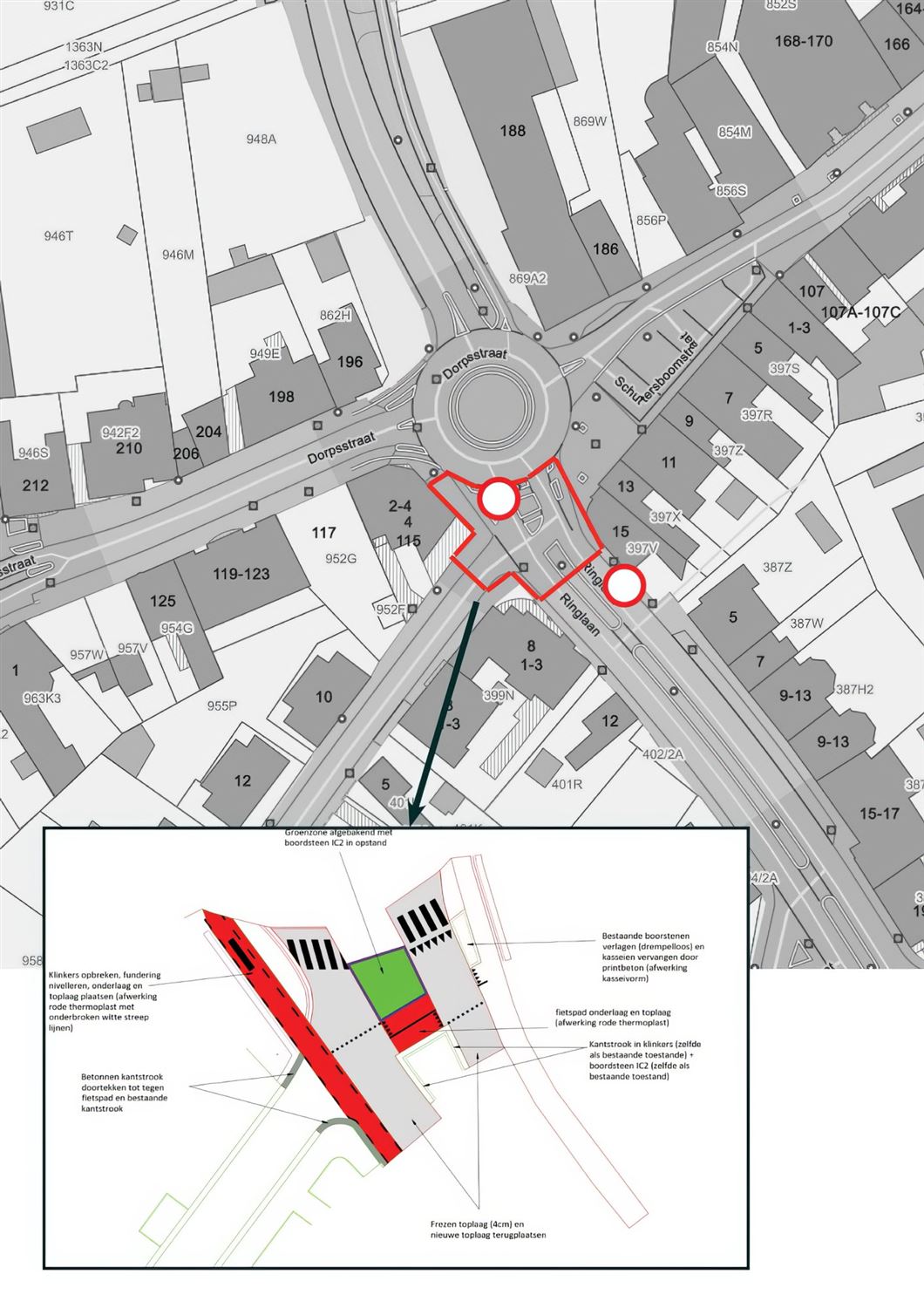 kruispunt van de Willem II-straat met de Ringlaan. Het kruispunt zal