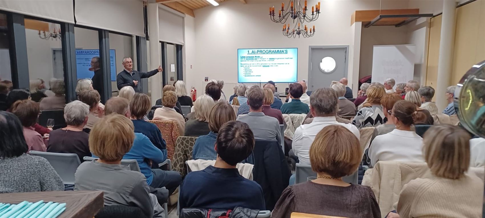 66 dames, samen met hun partners, in zaal De Kentings voor een boeiende lezing van