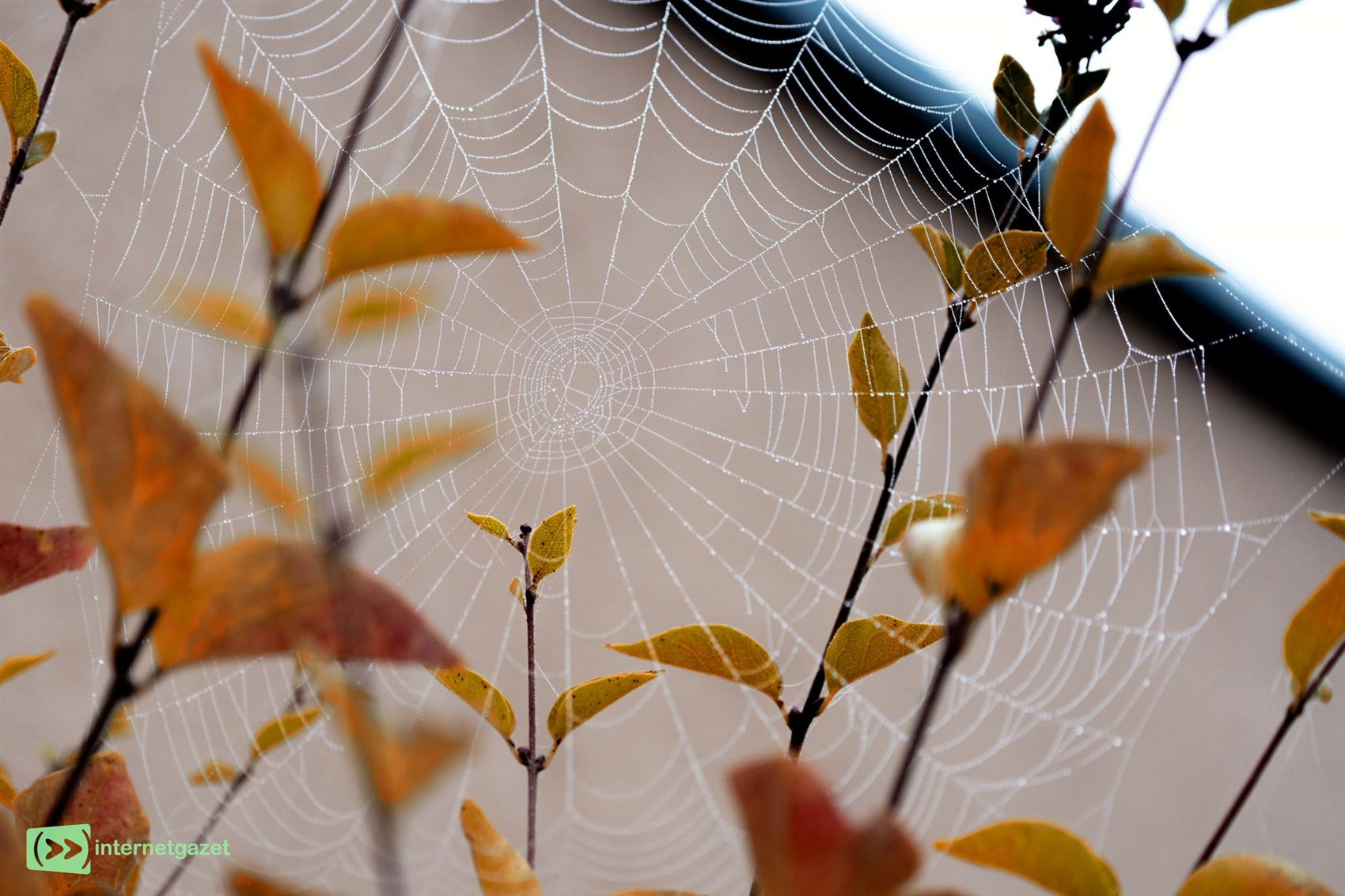 spinnenweb waarop minuscule waterdruppeltjes zich hebben vastgehecht. Ze vangen het licht en maken het web – normaal haast onzichtbaar – plots glashelder zichtbaar tegen de achtergrond. De mist trekt naar verwachting tegen de middag weg, waarna de zon zich laat zien.