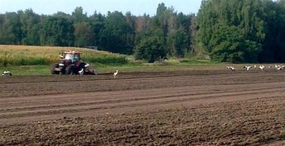 . Op de dag van de landbouw op 16 september in Overpelt zijn er bij boer Agten veel koeien te zien, maar vandaag meer ooievaars dan koeien, mailde hij. De foto's maakte hij met zijn gsm van op de tractor.