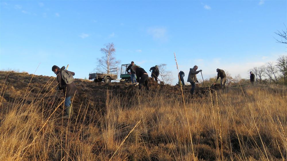natuurbehoud. Een duin, die ingenomen was door vergrassing, werd na een lichte machinale voorbereiding met vereende man- & vrouwkracht manueel met de klassieke mesthaak en hark terug opengemaakt. Vele handen maken licht werk en in een ontspannen sfeer met op tijd en stond een lekker drankje ging het werk zienderogen vooruit en kwam de duin terug in haar oude glorie van weleer. Het vrijgemaakte open zand is van groot belang in het voortbestaan van een aantal aan deze biotoop gebonden soorten, waaronder kevers, zandbijen, boomleeuweriken, nachtzwaluwen, tapuiten, enz..