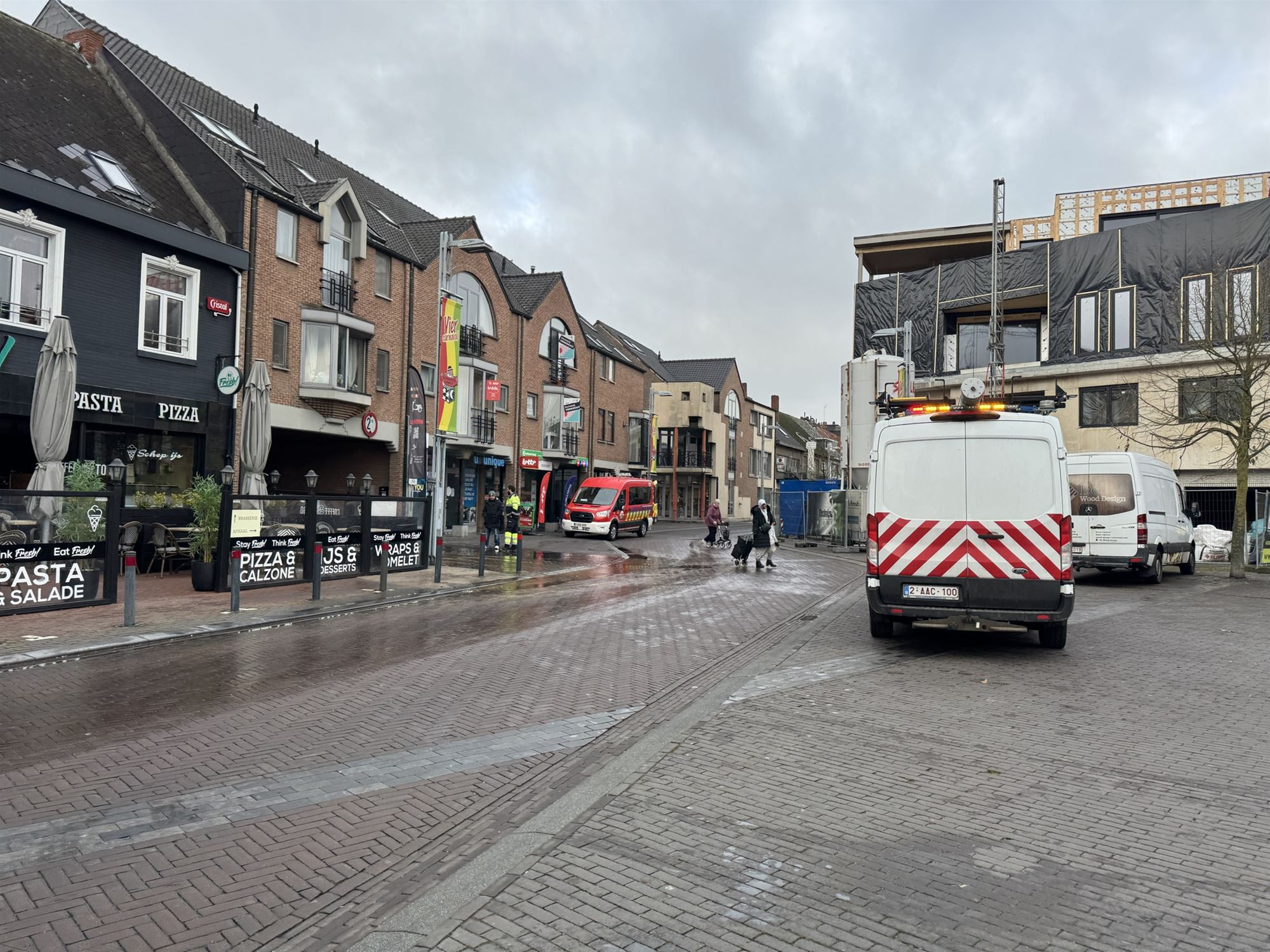 Dorpsstraat in Overpelt, ter hoogte van de Oude Markt, is deze voormiddag een ondergronds waterlek vastgesteld. Het lek zorgde ervoor dat verschillende kelders in de omgeving onder water liepen.