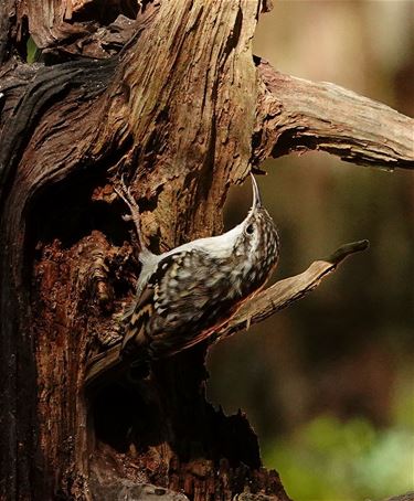 Boomkruiper. "Op het eerste gezicht maar een grauwe muis, als je hem zo met zijn aangepast snaveltje tegen een boomstam ziet zoeken naar insecten," zegt Jos. "Doch in close-up zie je pas hoe mooi bruin hij getint is, volledig opgaand in zijn omgeving - een boomstam."