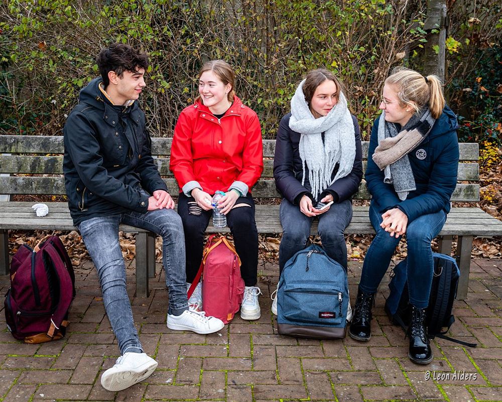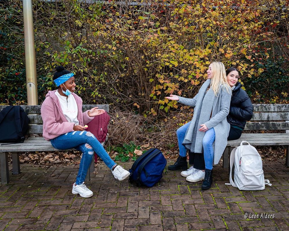 mensen op een benkske, want er zaten geen mensen op een benkske omdat het slecht weer was. Dus gaan we enkele dagen terug in onze voorraad foto's van Leon Alders. Deze jonge deernen werden gefotografeerd op een benkske in de Overpeltse