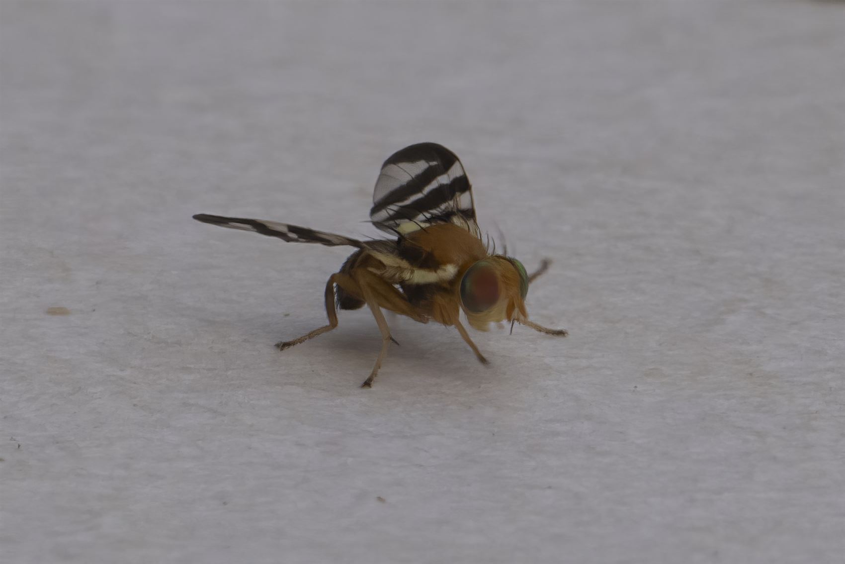 walnootboorvlieg (Rhagoletis completa). Met haar bruin-gele lijf en opvallend zwart-gestreepte vleugels is ze makkelijk te herkennen. Wat minder onschuldig is: deze soort is