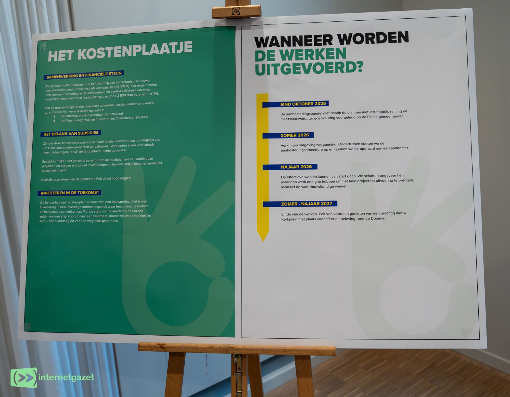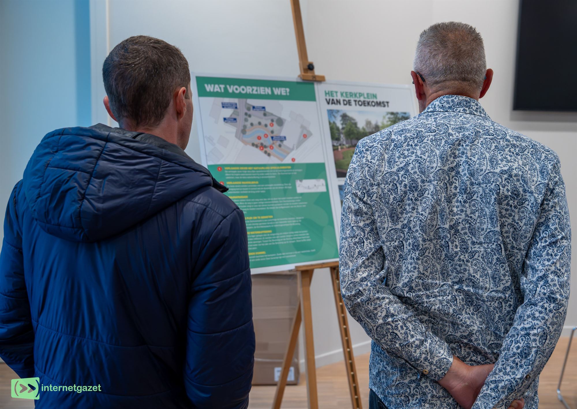 herinrichting van het Kerkplein. In de ceremoniezaal stonden verschillende infopanelen opgesteld met alle details over het project. Wie nog bijkomende vragen of opmerkingen had, kon terecht bij de aanwezige deskundigen.