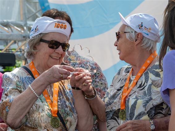 2 Peltse dames, kort voor de aankomst van het eerste peloton van de 1.000 km voor Kom op tegen Kanker, nog zo verheugd dat ze voor duizenden toeschouwers mochten vertellen hoe zij met het