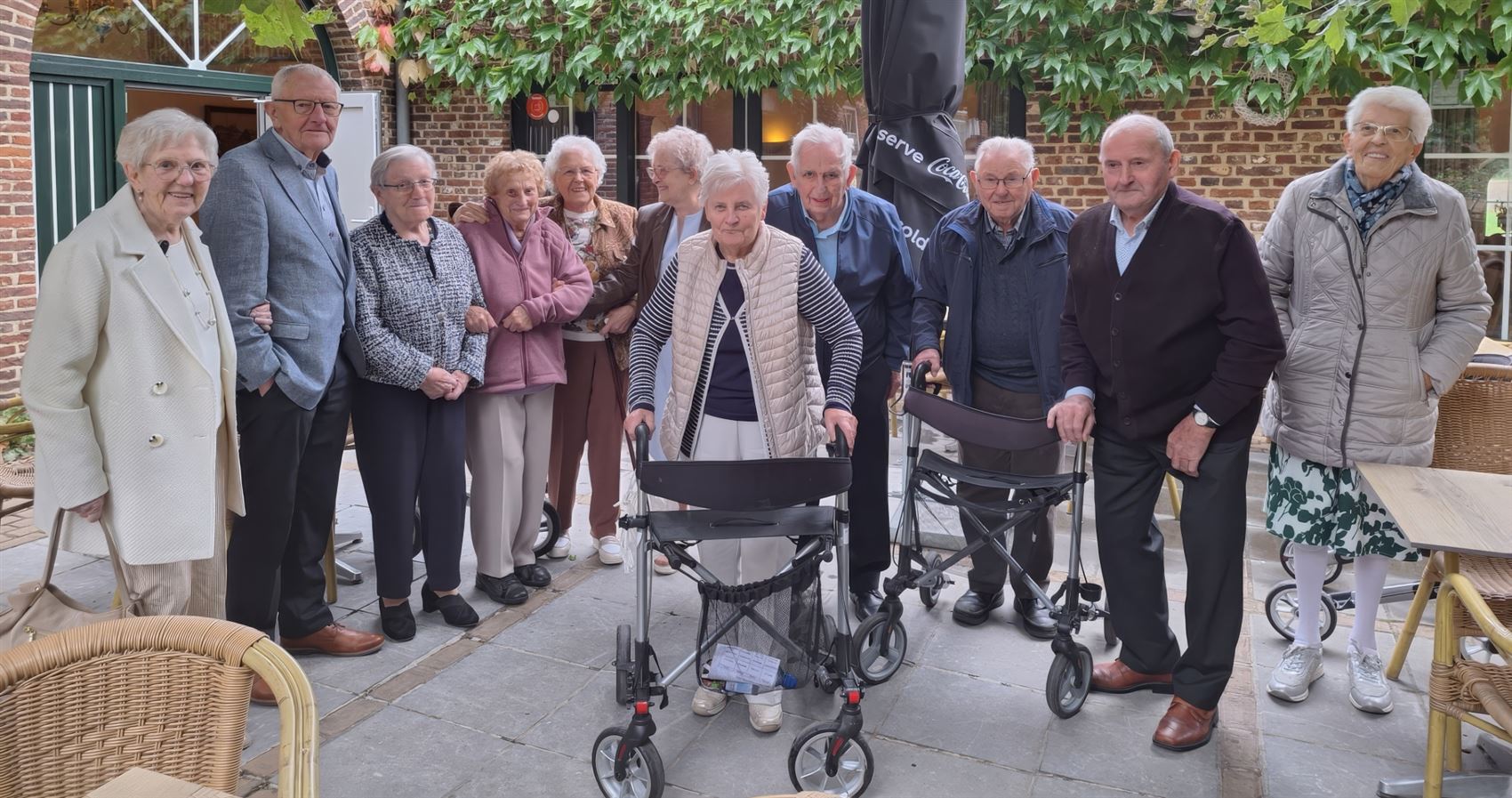 Op de groepsfoto ziet u: Lieske Vandebroek, Christ en Mia Bloemen-Wouters, Fina Brouwers, Toke Simons, Toke Driesen, Irma Eerdekens, Martin Van Hout, Jef Rabijns, Harry Achten en Tina Vandervelden — allen van het bouwjaar 1935.