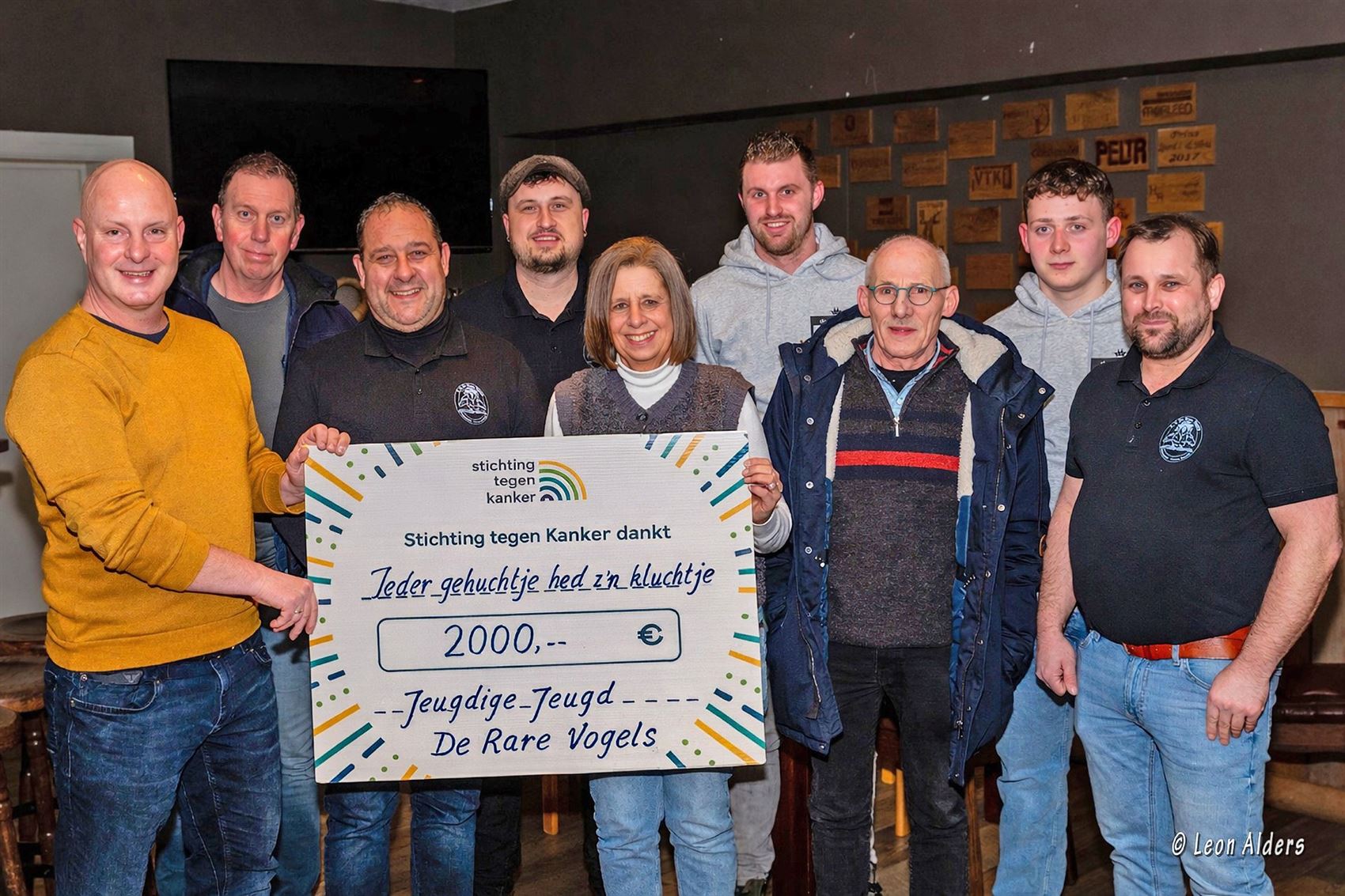 De toneelvereniging “Ieder gehuchtje héd zijn kluchtje” en de carnavalsverenigingen “De Rare Vogels” en “De Jeugdige Jeugd” overhandigden samen een cheque van 2.000 euro aan Monica Bloemen van de Stichting tegen Kanker.