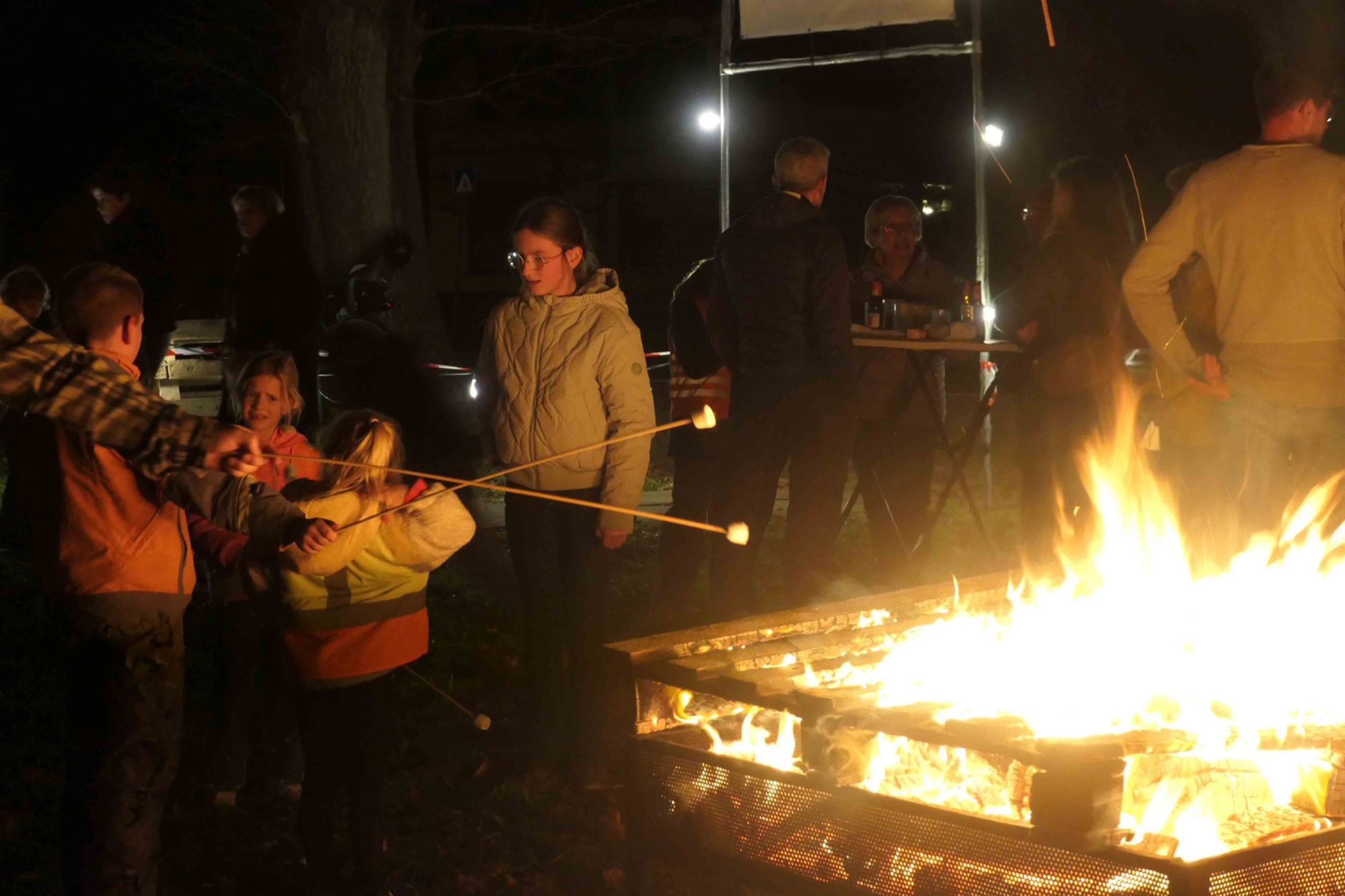 Zoals steeds werden de zelfgemaakte vuurkorven gevuld met pallethout — ideaal voor de kleinsten om hun marshmallows boven te roosteren en gezellig samen rond te staan. De opkomst was opnieuw mooi, met dank aan de buurtvrijwilligers die ook zorgden voor lekkers: warme choco, verse soep, een hotdog of een bo’ke met spek.