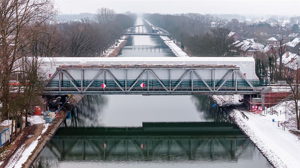 De restwerken zouden in principe geen lawaai meer mogen veroorzaken."Jens Veraa maakte bijgaande dronefoto op 20 januari, toen het gesneeuwd had. Vooraan de "ingepakte" spoorbrug.