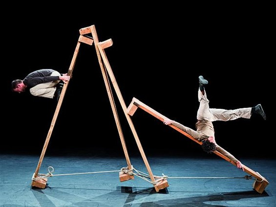 houten banken, touwen en twee zwierende acrobaten. Hun spel neemt je mee naar een gekke wereld waar evenwicht een speelmaatje is en kwajongens die zwaartekracht tarten. Deze jonge Franse compagnie won 2008 het prestigieuze concours