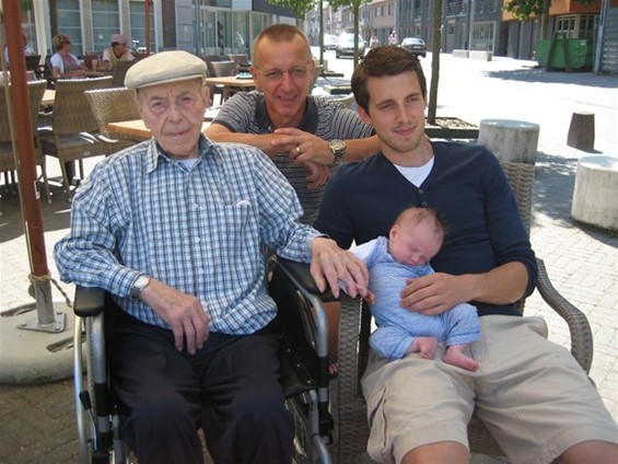 familie Plessers en zorgt ervoor dat ze daar voor de tweede keer in de familie vier generaties kunnen vieren. Op de foto Emiel, papa Bram, grootvader Toon en overgrootvader Thieu. Alleen Thieu woont nog in Overpelt, de rest van de familie week uit