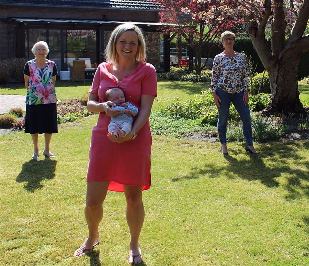 Kaat Biemans geboren. Ze zorgde meteen voor vier generaties. Op de foto, op veilige afstand van elkaar: Elisa Van Lishout (89), Huguette Bloemen (53),