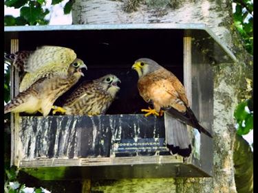 familie Torenvalk (met 4 jonge valken) en dit de laatste week dat ze in de nestkast verbleven. Eind juni zijn ze uitgevlogen. Je ziet hoe ze gevoederd worden, braakballen uitspuwen, een eerste vluchtpoging ondernemen, om dan enkele dagen te oefenen in omliggende bomen en struiken. Om uiteindelijk definitief uit te vliegen.
