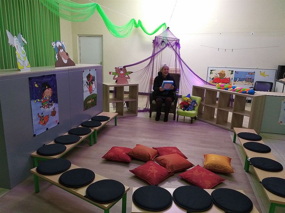 leesplezier bij hun leerlingen te verhogen. In de kleuterschool van de Vloeterstraat is een voorleeslokaal ingericht waar de juffen, ouders, grootouders gaan voorlezen. Ook de wijkscholen hebben in hun kleuterklas een voorleeshoek ingericht. In de lagere school gaan de leerlingen van het 6de leerjaar aan de hand van een