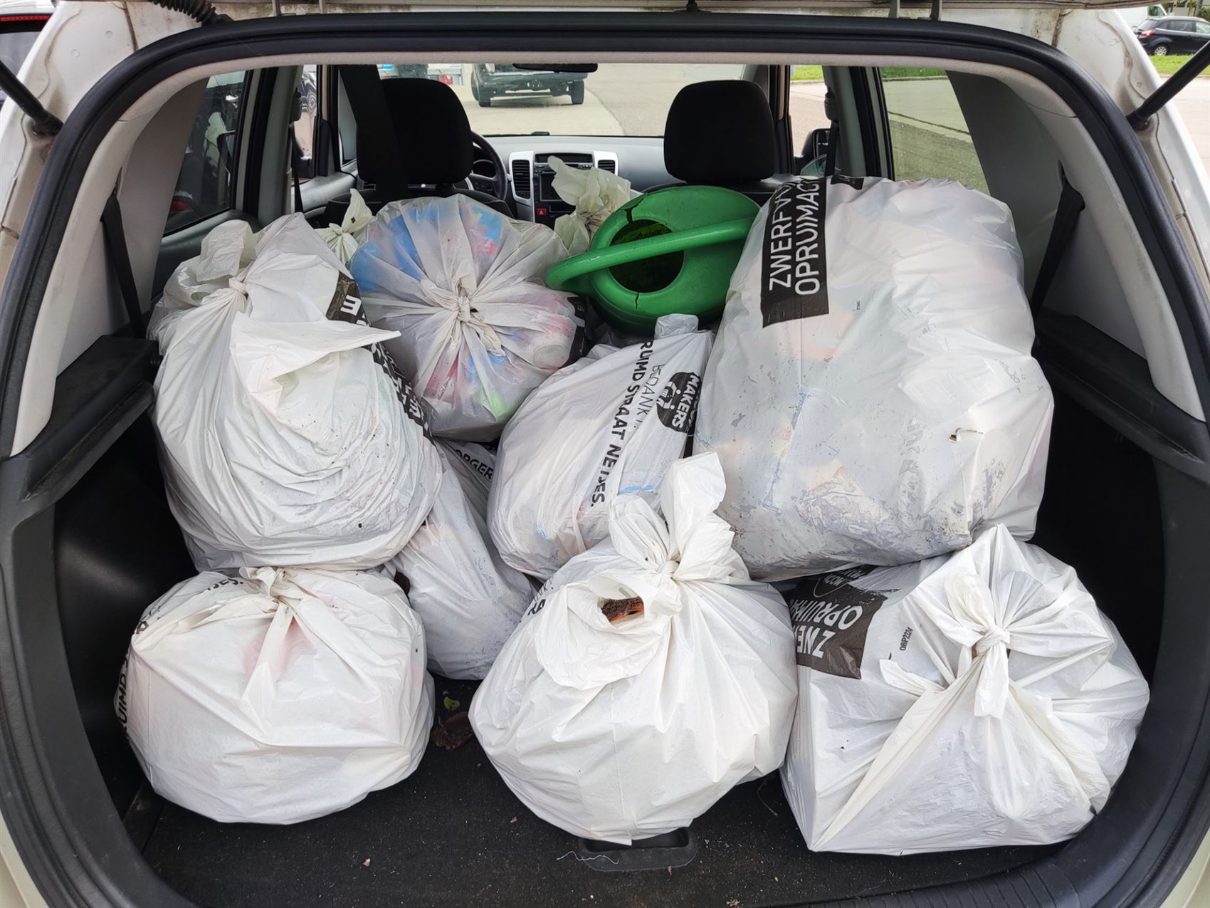 Na enkele uren opruimen waren 17 zakken gevuld, vooral met blikjes bier en frisdrank, verpakkingen en talloze sigarettenpeuken.