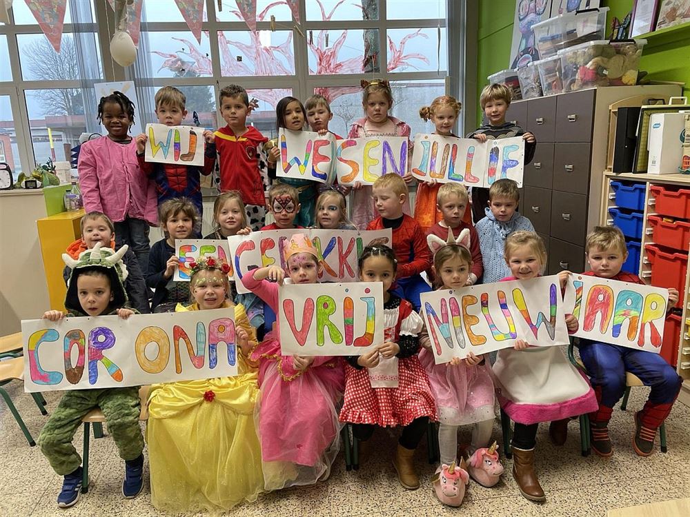 kleuterschool Helibel Lille. "We kunnen jammer genoeg geen driekoningen gaan zingen aan de kerststal of de postbode uitnodigen in de klas," zeggen ze daar. "We dromen van knuffelen met oma en opa of vriendjes, carnaval vieren en dansen in de parochiezaal. Naar school gaan, kan gelukkig wel. Ons verkleden, vrolijke wensen maken en deze posten op de Internetgazet hoort daarbij! Dus bij deze wensen de kapoenen uit de Kikkerklas jullie allemaal 'EEN GELUKKIG EN CORONAVRIJ NIEUW JAAR!'"
