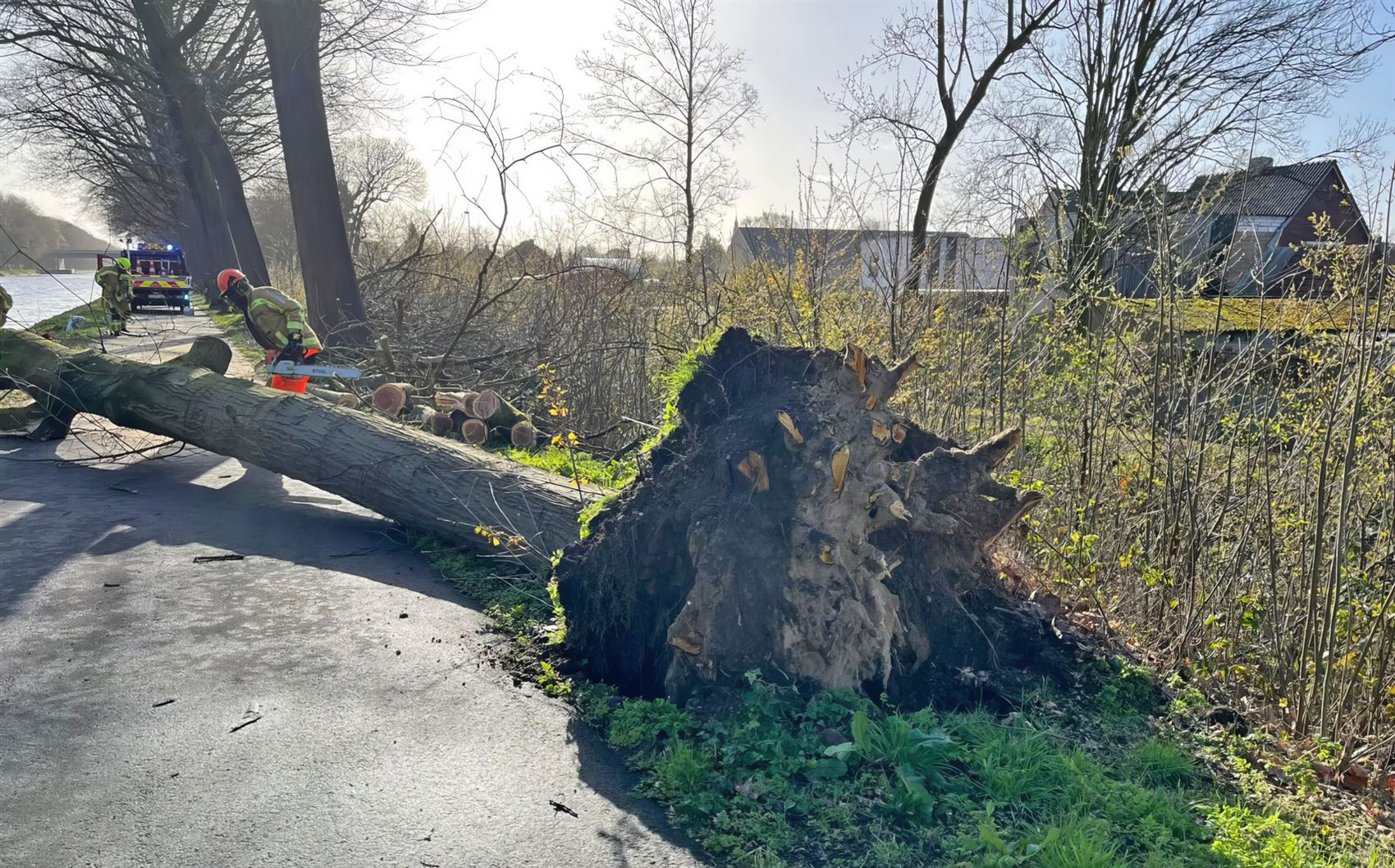 De brandweer was intussen ter plaatse en ging meteen aan de slag om het jaagpad opnieuw vrij te maken. Met kettingzagen werd de boom in stukken gezaagd, zodat wandelaars en fietsers opnieuw veilig gebruik kunnen maken van het pad.