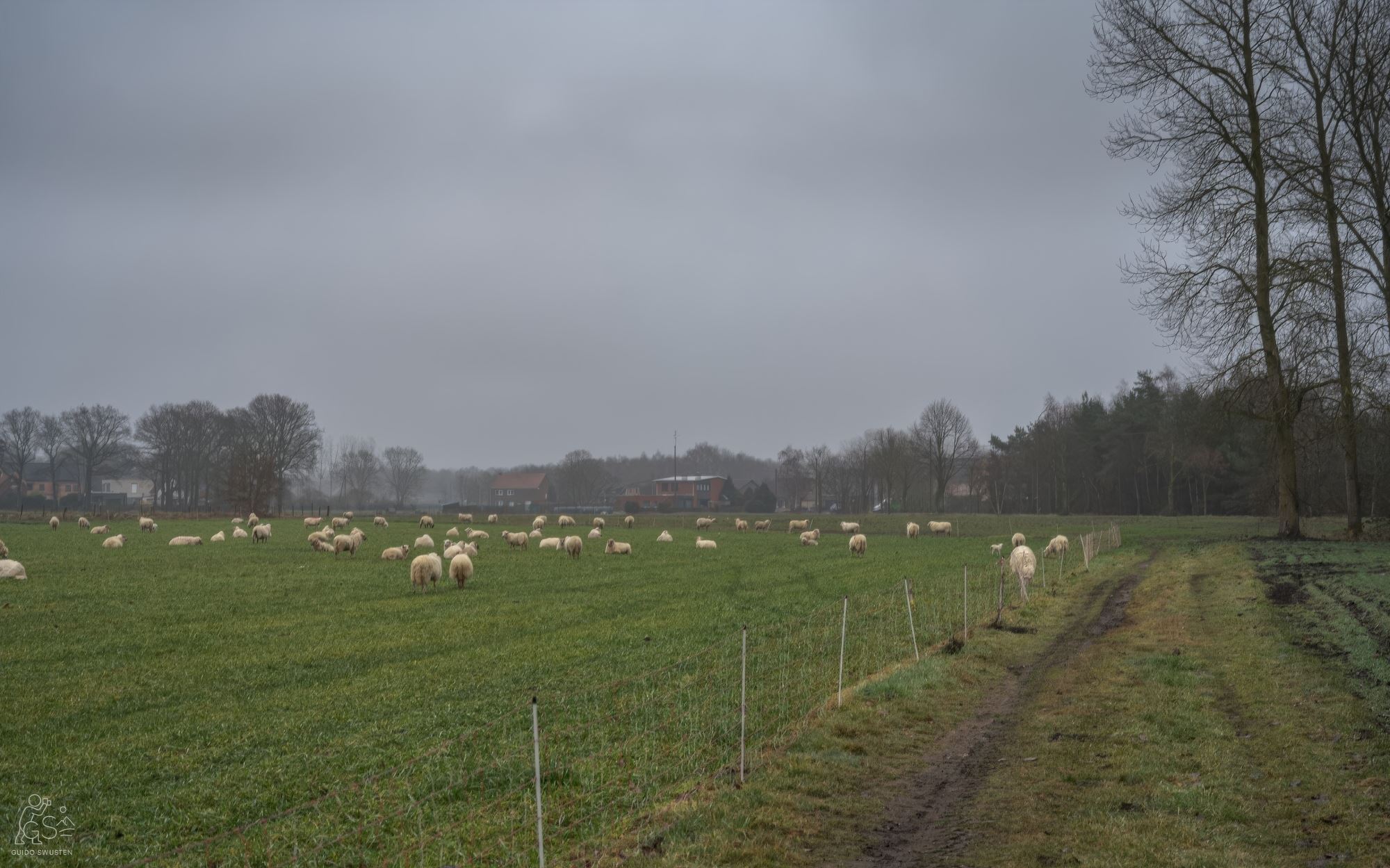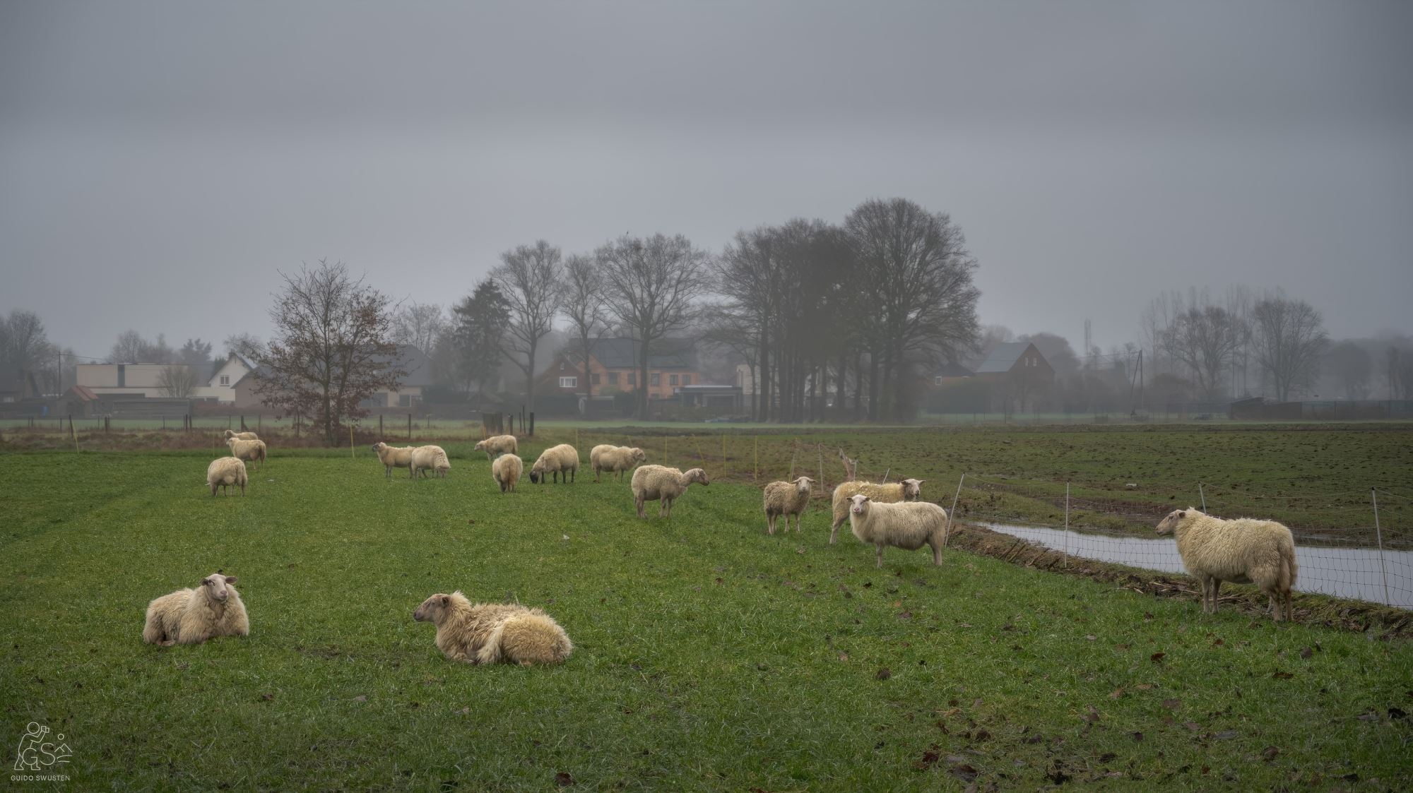dikke winterjas. Als deze schapen inspraak hadden, stond er vermoedelijk een gezellig afdakje en misschien zelfs roomservice klaar, met een extra portie vers hooi. Maar ach, zolang het gras groen genoeg blijft om smakelijk te zijn, lijken ze zich nergens zorgen over te maken. Deze verrassende kudde werd gespot in een weiland tussen de Hayenhoek en de Zonhoekstraat (Grote-Heide) - toch geen alledaags zicht op die plek. Nu alleen hopen dat wolf Noëlla haar gps even uitgeschakeld laat…