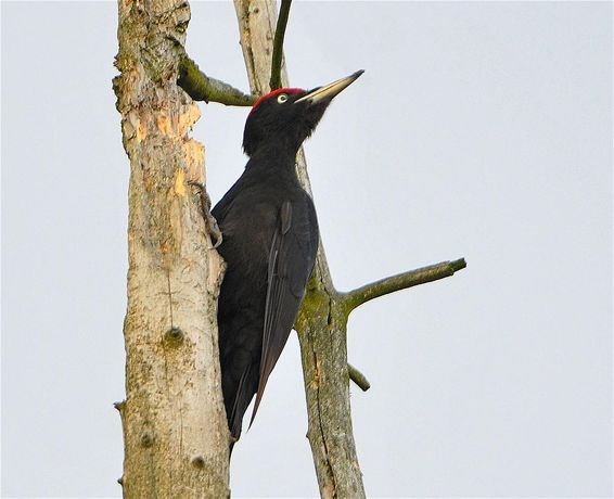 Zwarte specht voor de lens van