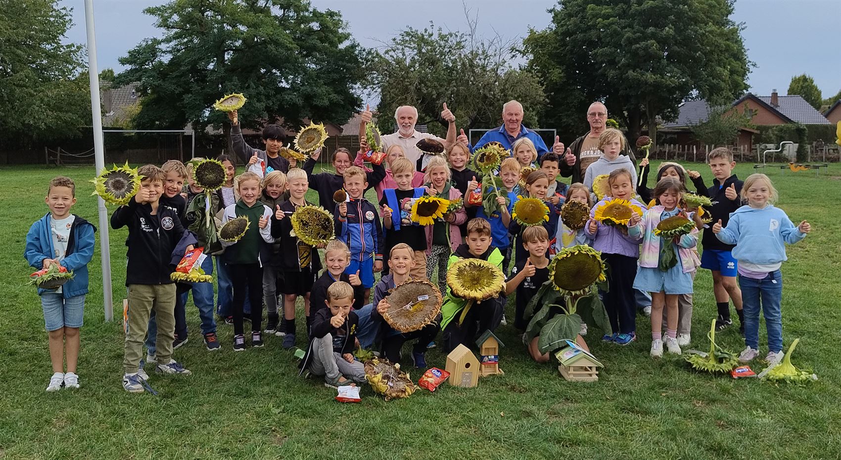 Nox Doelman met de overwinning aan de haal: zijn zonnebloem had een indrukwekkende omtrek van 117 cm. Nate Vanherle werd knap tweede met 116 cm, en Miel Neuteleers behaalde de derde plaats met 110 cm. De drie laureaten mochten elk een vogelvoederhuisje mee naar huis nemen — ideaal om hun zelf geoogste zonnebloempitten in te doen.