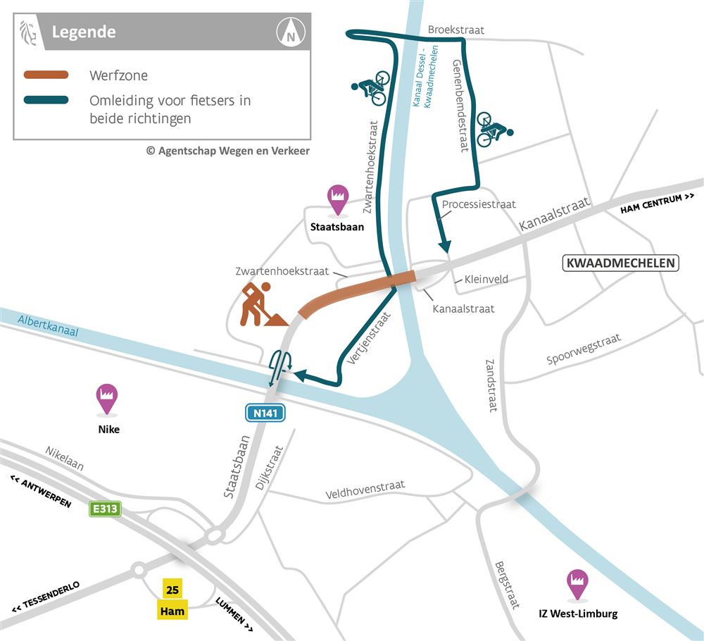 Voor fietsers op de Staatsbaan geldt er een veilige omleiding rond de werfzone via de jaagpaden en de brug over het kanaal aan de Broekstraat. In samenspraak met de gemeente Ham kunnen er nog lokale maatregelen op de omliggende gemeentewegen worden ingevoerd, zodat de bereikbaarheid en de veiligheid in de naburige woonwijken gegarandeerd blijft. De dienstverlening van De Lijn blijft gegarandeerd.