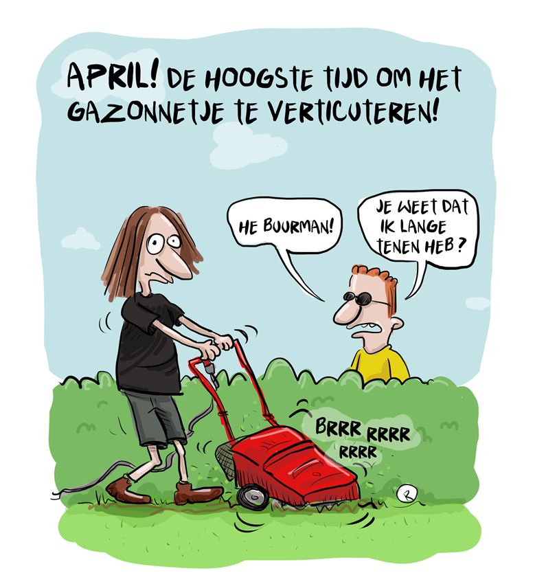 . Voor de reactie van de man die zijn buurman met de verticuteermachine bezig zag, had hij dit mooie tekstje in petto. Het zal je maar overkomen!